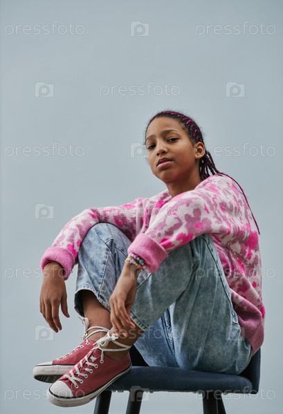 Черная девочка-подросток, одетая в модную повседневную одежду на синем фоне
