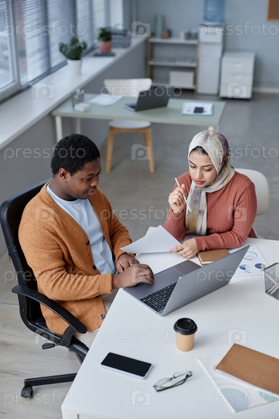 Верхний угол двух молодых межкультурных коллег, готовящих презентацию