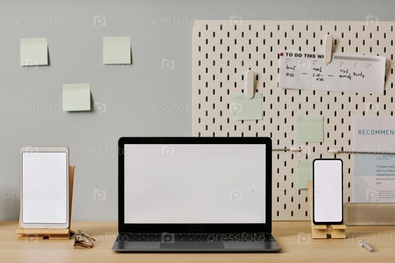 Мокет переднего вида трех экранов устройств на рабочем месте