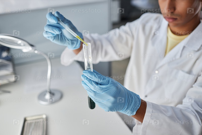 Молодой человек держит пробирку в лаборатории