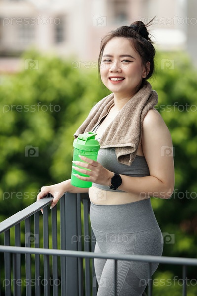 Позитивная азиатская спортсменка стоит на балконе