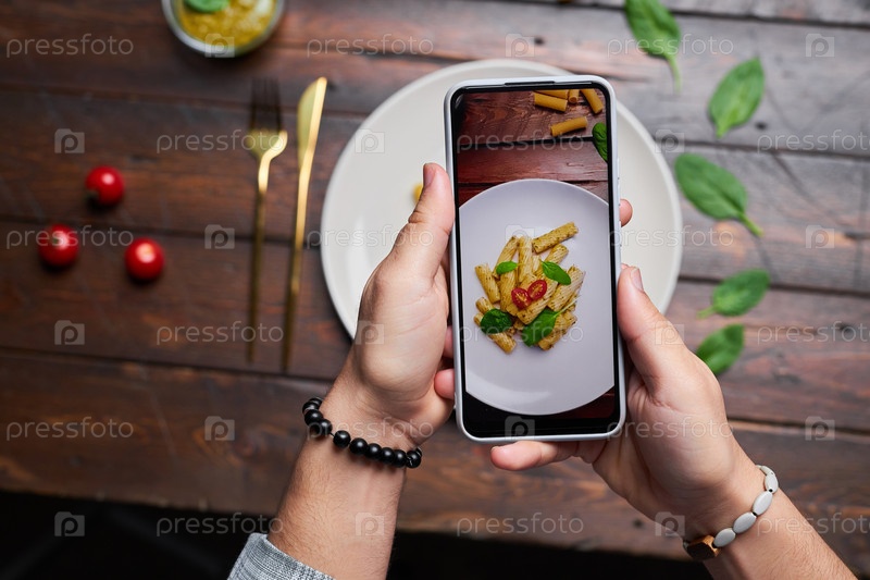 Фотограф делает фотографию еды на телефоне