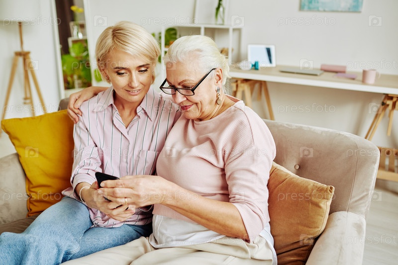 Пожилая женщина с взрослой дочерью, использующая смартфон