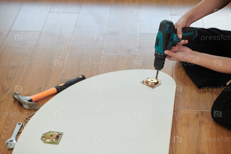 Женщина, собирающая мебель