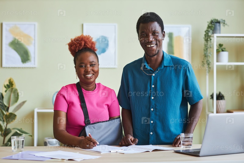 Улыбающаяся женщина с травмой руки работает в офисе со своим коллегой