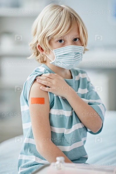 Маленький мальчик показывает пластырь от вакцинации