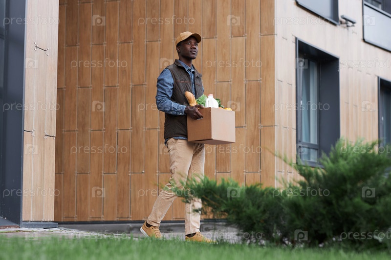 Мужчина, несущий коробку с продуктом на улице, доставляет еду в городе