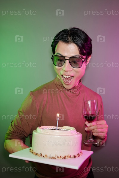 Взволнованный мужчина с тортом на день рождения