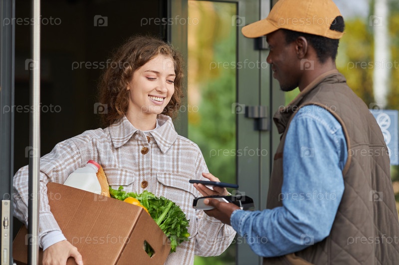 Улыбающаяся женщина платит за доставку на улице и держит коробку с продуктом