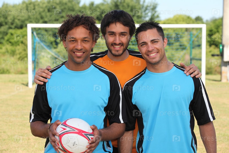 Три молодых футболиста перед воротами