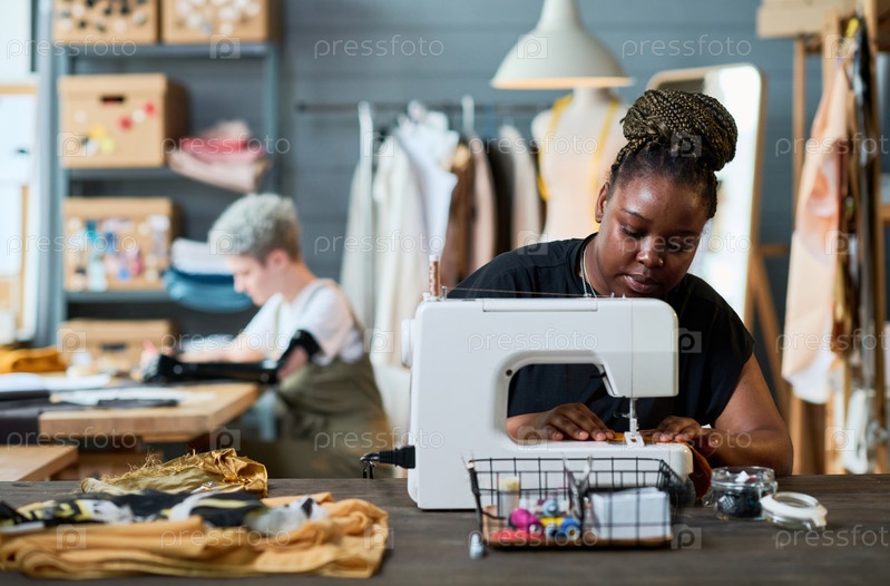 Молодая афроамериканская бизнесвумен использует на работе электрическую швейную машину