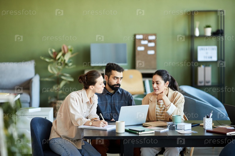 Молодая женщина делится своими идеями или точкой зрения с коллегами во время работы