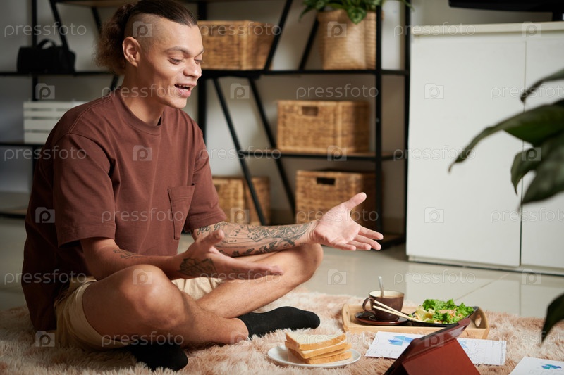 Мужчина разговаривает с коллегами на онлайн-встрече