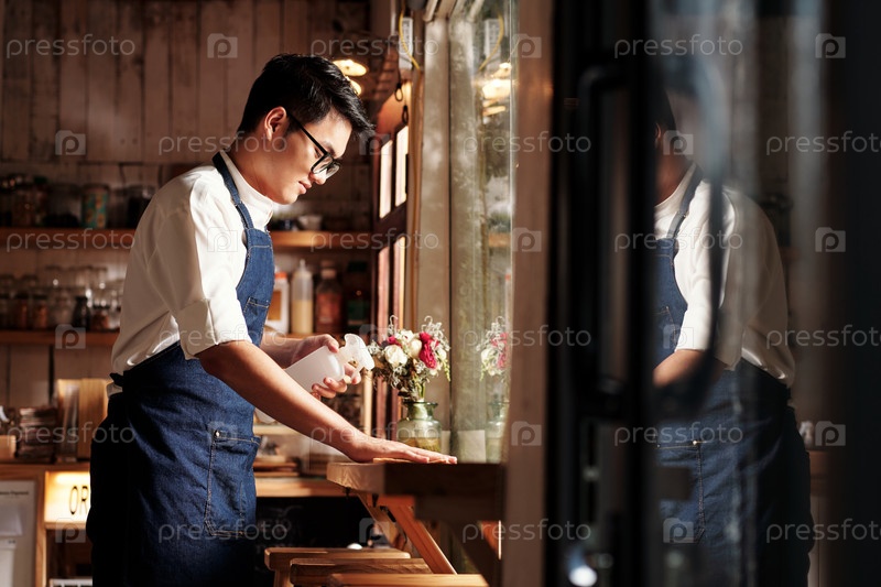 Бариста стирает поверхности в кофейне