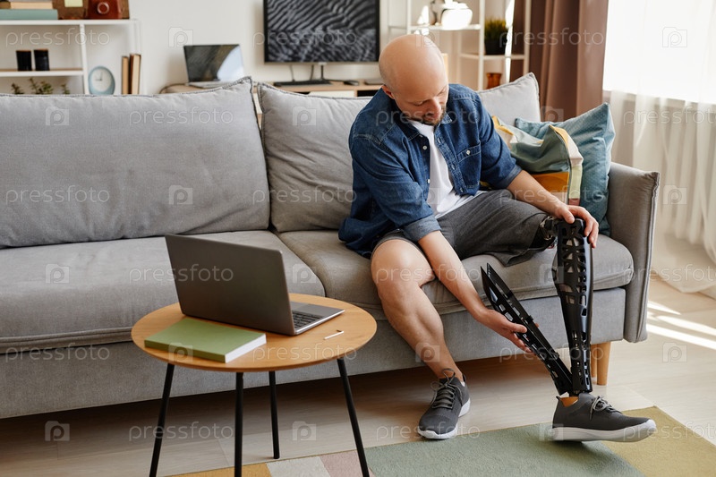 лысый мужчина, надевающий протез ноги дома