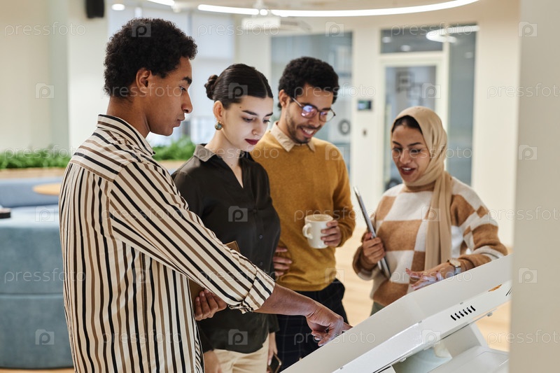Группа молодых арабских бизнесменов, использующих цифровой экран в офисе