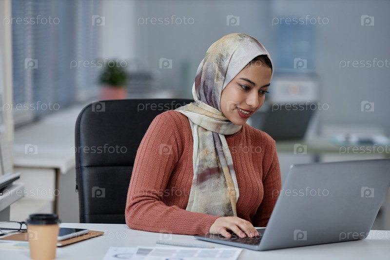 Молодая улыбающаяся мусульманская бизнесвумен в плато использует ноутбук