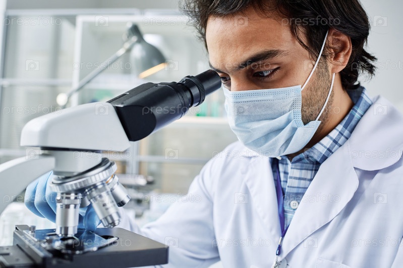 Близкий план молодого клинициста в защитной маске, изучающего новый вирус или бактерию