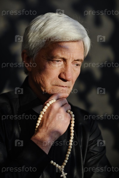 Вертикальный белокожий старший священник, держащий молебен глубоко в мыслях