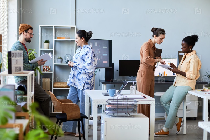 Две небольшие группы коллег обсуждают свои идеи и заметки в офисе