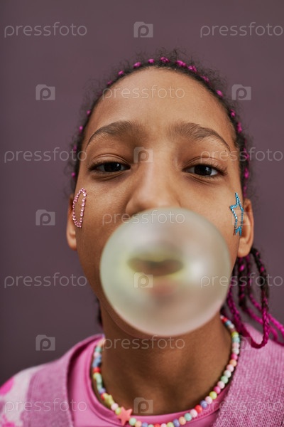 Рыбоглазая чёрная девочка-подросток дует пузырь из жевательной резинки
