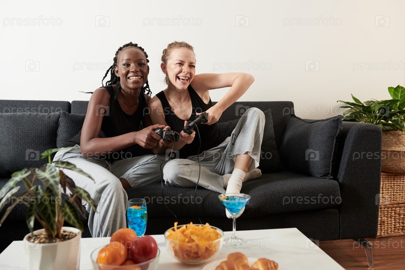 Разнообразная лесбийская пара играет в видеоигры