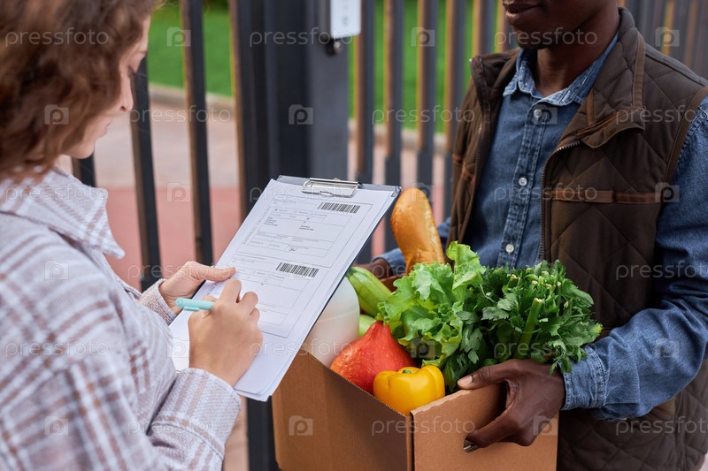 Ключовое изображение женщины, подписывающей документ о принятии доставки еды на улице