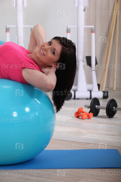 Молодая женщина делает упражнения на фитнес-мяче в тренажерном зале