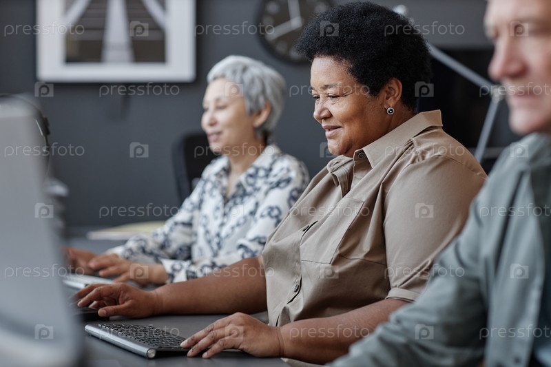 Старшая чернокожая женщина, использующая компьютер и улыбаясь в школе для пожилых людей