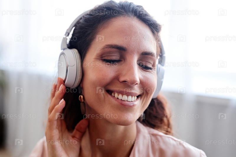 Закройте радостную женщину, которая носит наушники и слушает музыку в помещении
