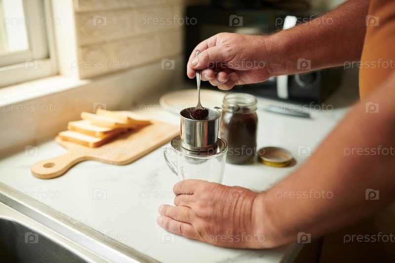 Человек добавляет измельченный кофе в фильтр пин