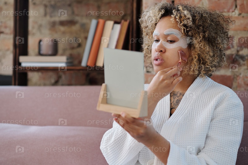 Молодая женщина в халате массажирует свое лицо кварцевым роликом