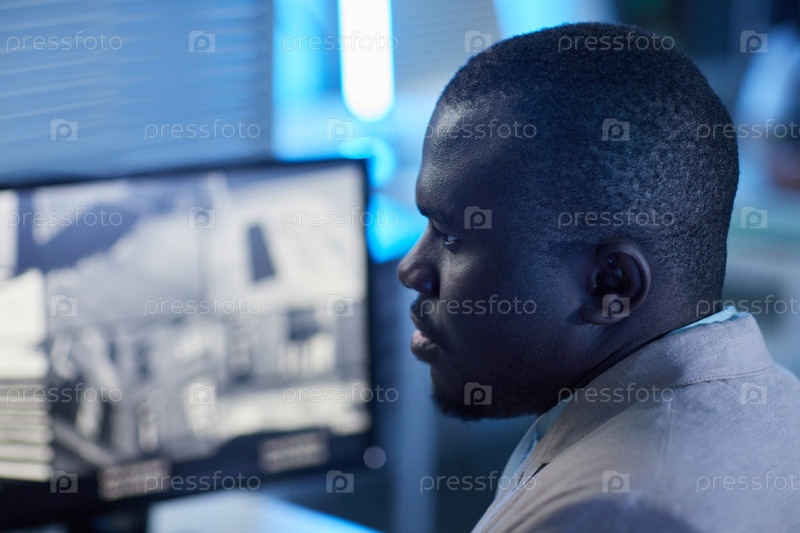 Мужчина смотрит на запись камер видеонаблюдения в центре мониторинга и безопасности