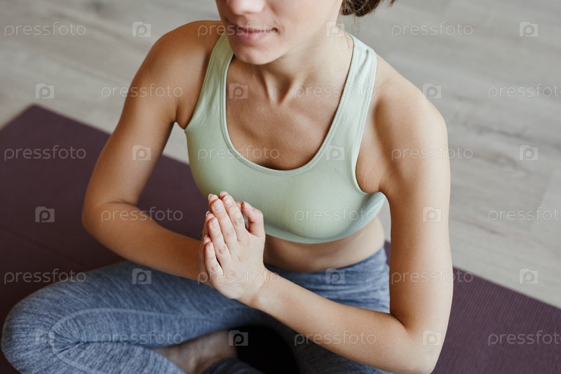Молодая женщина медитирует в помещении, сидя в положении лотоса с зажатыми руками