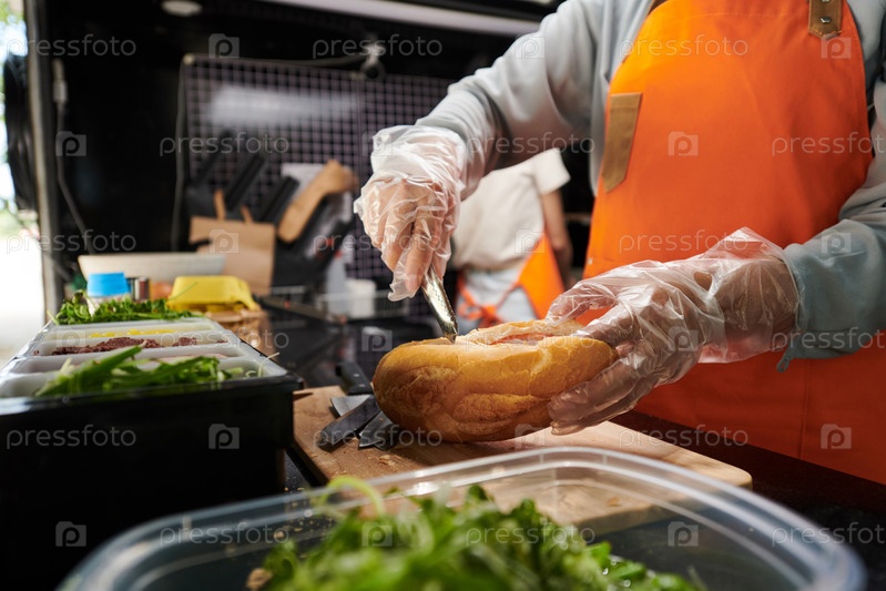 Перчатки рук молодой женщины в фартуке, которая кладет кусочки бекона в бутерброд