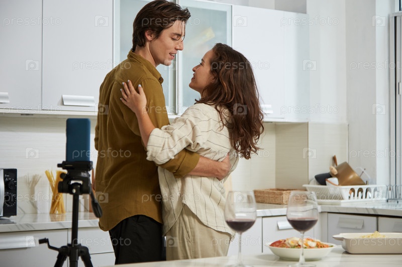 Влюбленная пара снимает романтическое видео о себе, танцуя на кухне