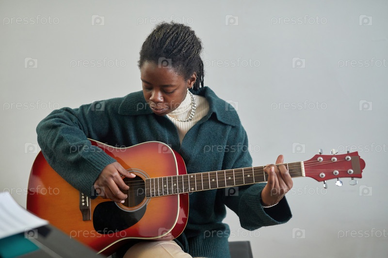 Женщина учится играть на гитаре