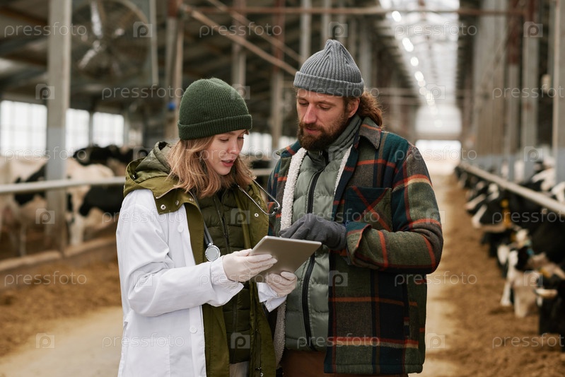 Ветеринар и фермер работают вместе в современном сарае