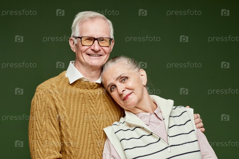 Счастливый пожилой муж и жена в пуловерах, стоящие рядом друг с другом