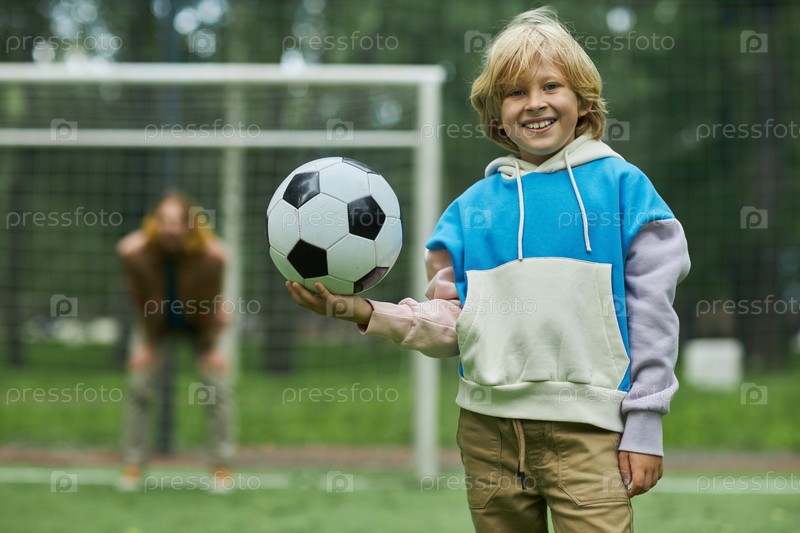Улыбающийся блондин держит мяч и смотрит на камеру снаружи