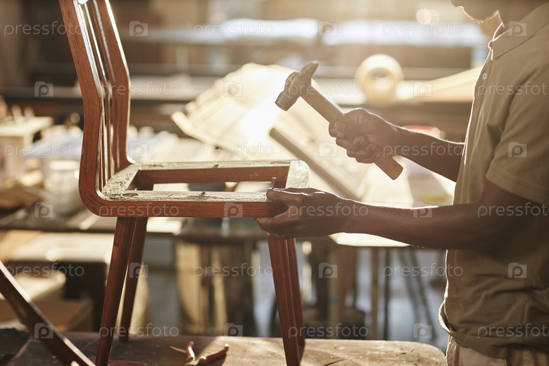 Близкий план черного ремесленника, фиксирующего мебель на солнечном свете