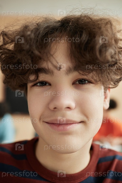 Портрет мальчика-подростка с кудрявыми волосами, смотрящего на камеру в школе