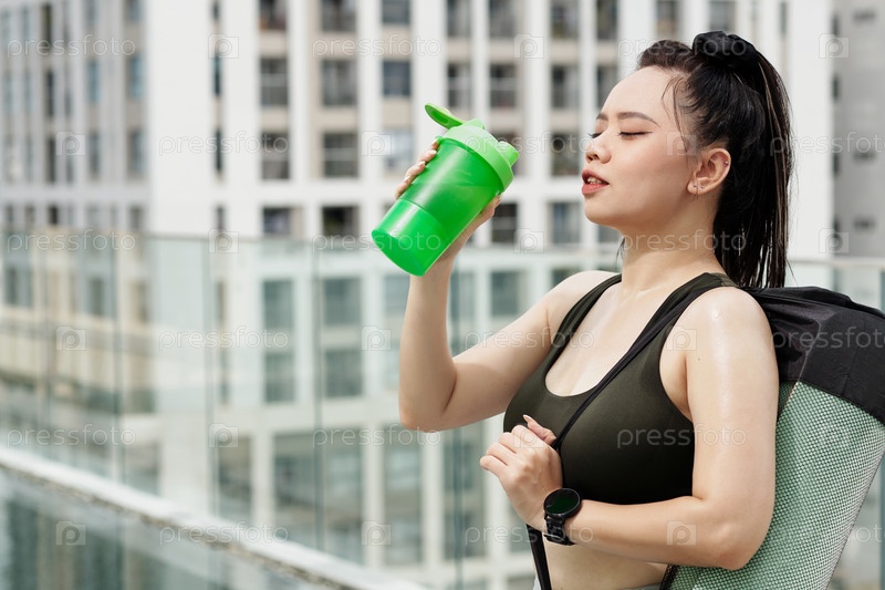 Жаждающая спортсменка пьет воду