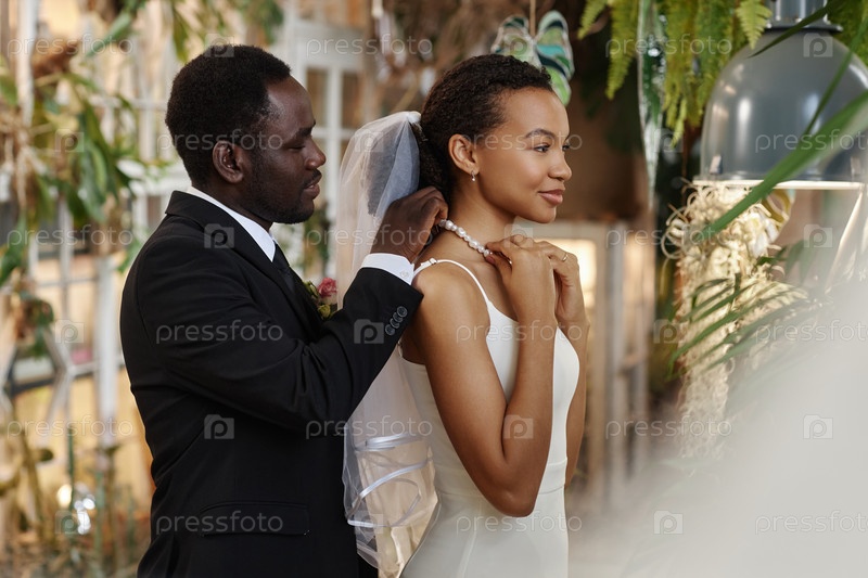Молодая черная пара выходит замуж Жених помогает невесте с ожерельем