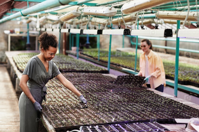 Две молодые межкультурные фермеры, заботящиеся о саженцах растений