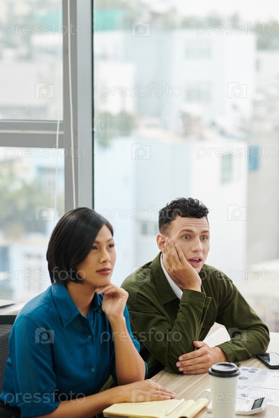 Взволнованные деловые люди слушают спикера