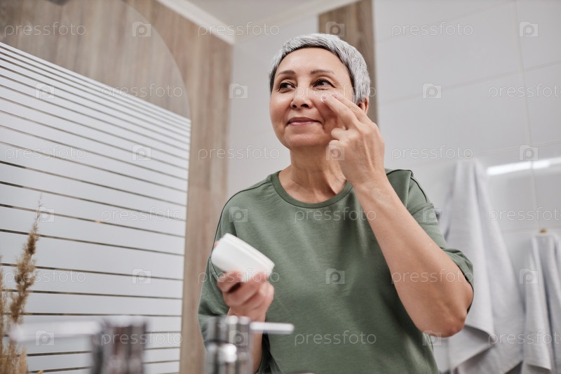 Азиатская старшая женщина, использующая крем для лица во время рутины ухода за кожей по утрам