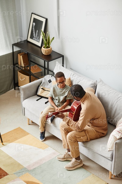 Отец учит сына гитаре под высоким углом