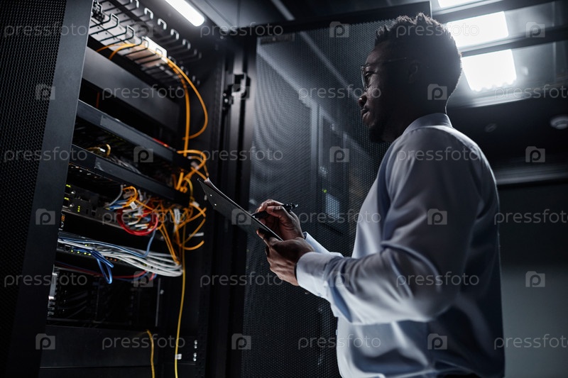Подсвеченный чернокожий мужчина работает с серверным шкафом и делает заметки на клипборд