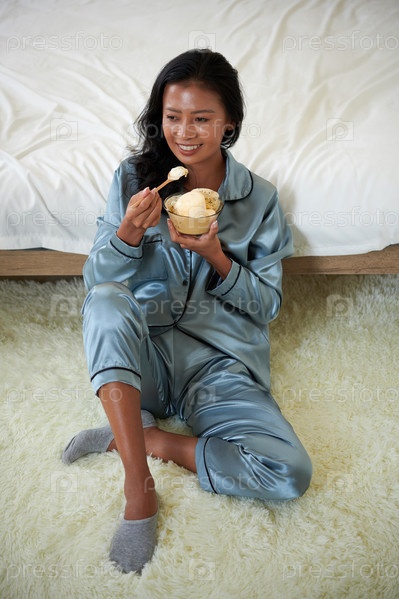 Улыбающаяся женщина ест мороженое